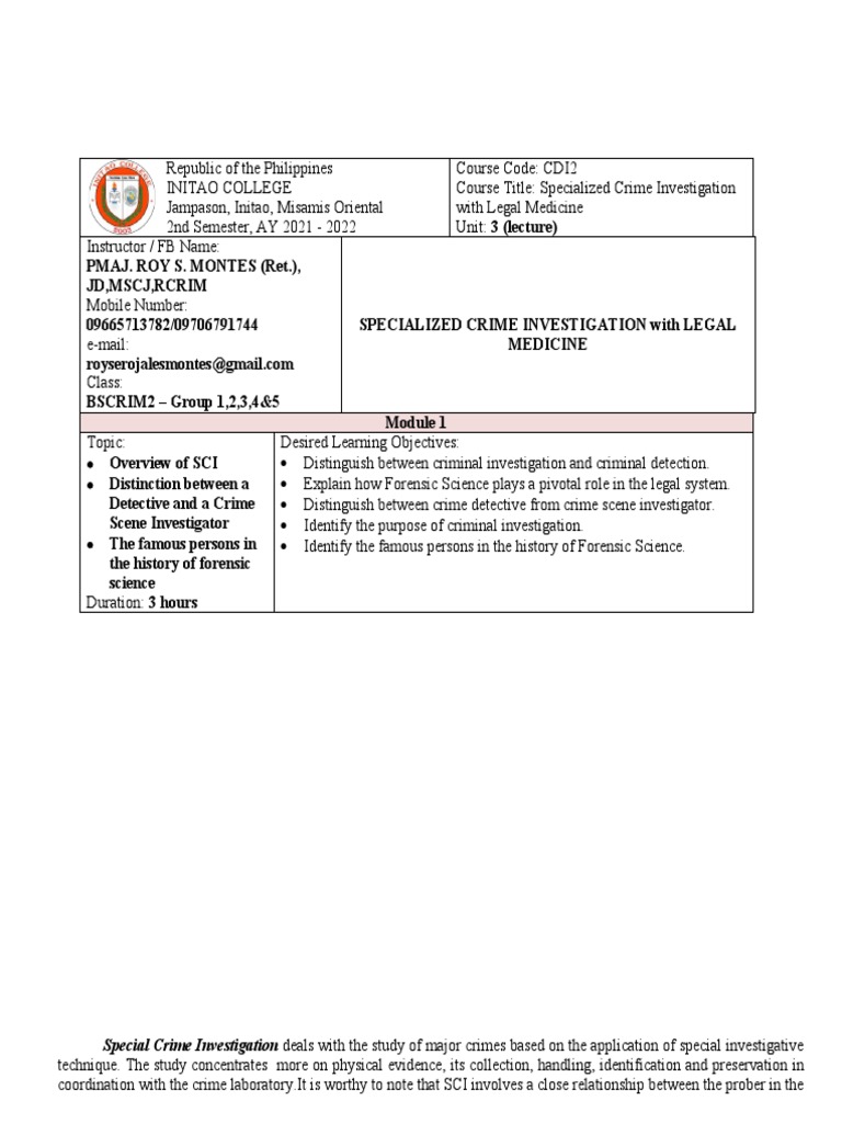 INITAO COLLEGE Course Title: Specialized Crime Investigation