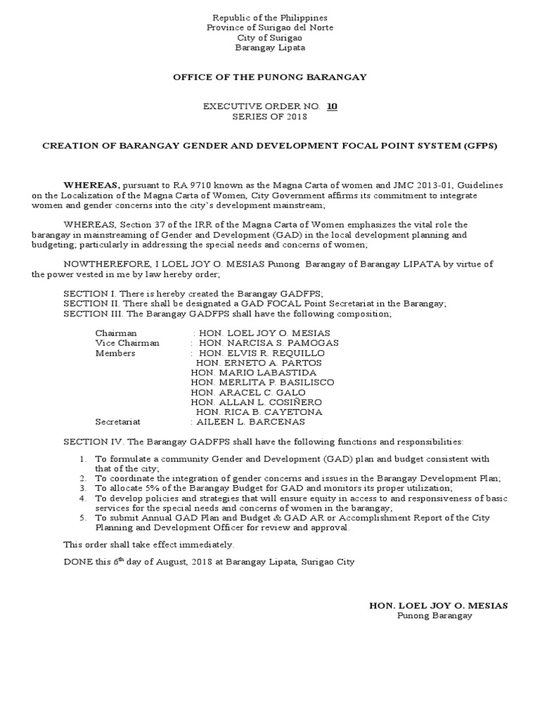 CREATION OF BARANGAY GENDER AND DEVELOPMENT FOCAL POINT SYSTEM (GFPS)