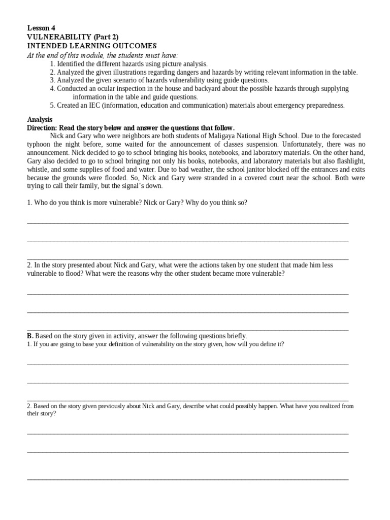 3. Analyzed the given scenario of hazards vulnerability using guide questions.