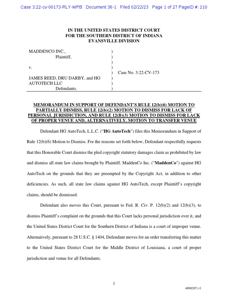 AutoTech’s Software. Doc. 2, ¶ 18. MaddenCo alleges that HG AutoTech was aware of Reed and
