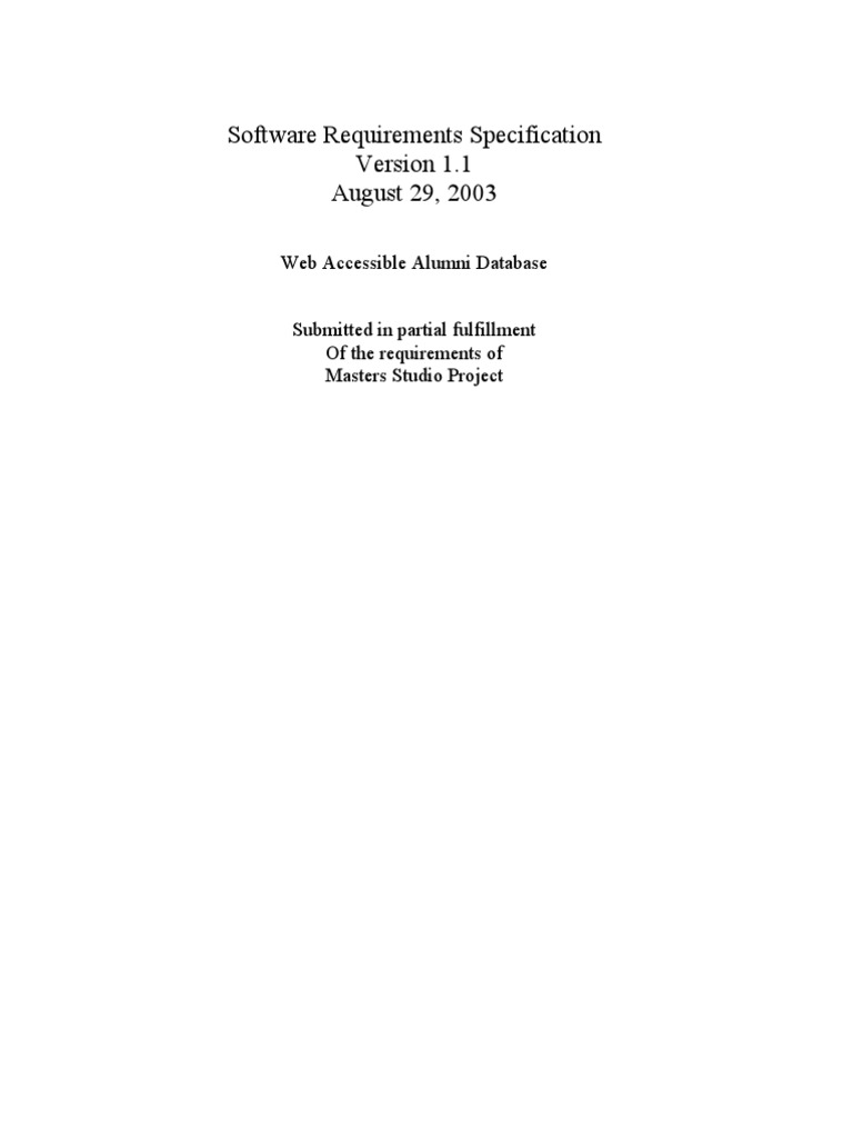 1.1. Introduction This Software Requirements Specification provides a complete description of all the functions and specifications of the Jacksonville State University Computing and Information Sciences (CIS) Web Accessible Alumni Database. The expected audience of this document is the faculty of CIS, including the faculty who will use this system, Dr. Dennis Martin and studio committee members, and the developer. It will also server as a reference for Studio students.