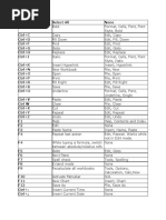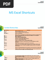 CTRL+W Closes the selected workbook window. CTRL+X Cuts the selected cells. CTRL+Y Repeats the last command or action, if possible. Uses the Undo command to reverse the last command or to delete the last entry you typed. CTRL+Z CTRL+SHIFT+Z uses the Undo or Redo command to reverse or restore the last automatic correction when AutoCorrect Smart Tags are displayed. Function keys Key Displays the Help task pane. CTRL+F1 closes and reopens the current task pane. F1 ALT+F1 creates a chart of the data in the current range. ALT+SHIFT+F1 inserts a new worksheet. Edits the active cell and positions the insertion point at the end of the cell contents. It also moves the insertion point into the Formula Bar when editing in a cell is turned F2 off. SHIFT+F2 edits a cell comment. Pastes a defined name into a formula. F3 SHIFT+F3 displays the Insert Function dialog box. Repeats the last command or action, if possible. F4 CTRL+F4 closes the selected workbook window. Displays the Go To dialog box. F5 CTRL+F5 restores the window size of the selected workbook window. F6 Switches to the next pane in a worksheet that has been split (Window menu, Split command). SHIFT+F6 switches to the previous pane in a worksheet that has been split. CTRL+F6 switches to the next workbook window when more than one workbook window is open. Note When the task pane is visible, F6 and SHIFT+F6 include that pane when switching between panes. F7 Displays the Spelling dialog box to check spelling in the active worksheet or selected range. Description