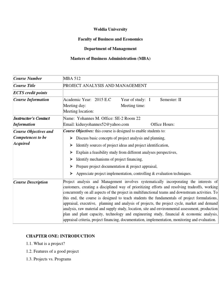 this end, the course is designed to teach students the fundamentals of project formulations,