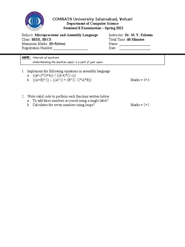 Subject: Microprocessor and Assembly Language Instructor: Dr. M. Y. Faheem