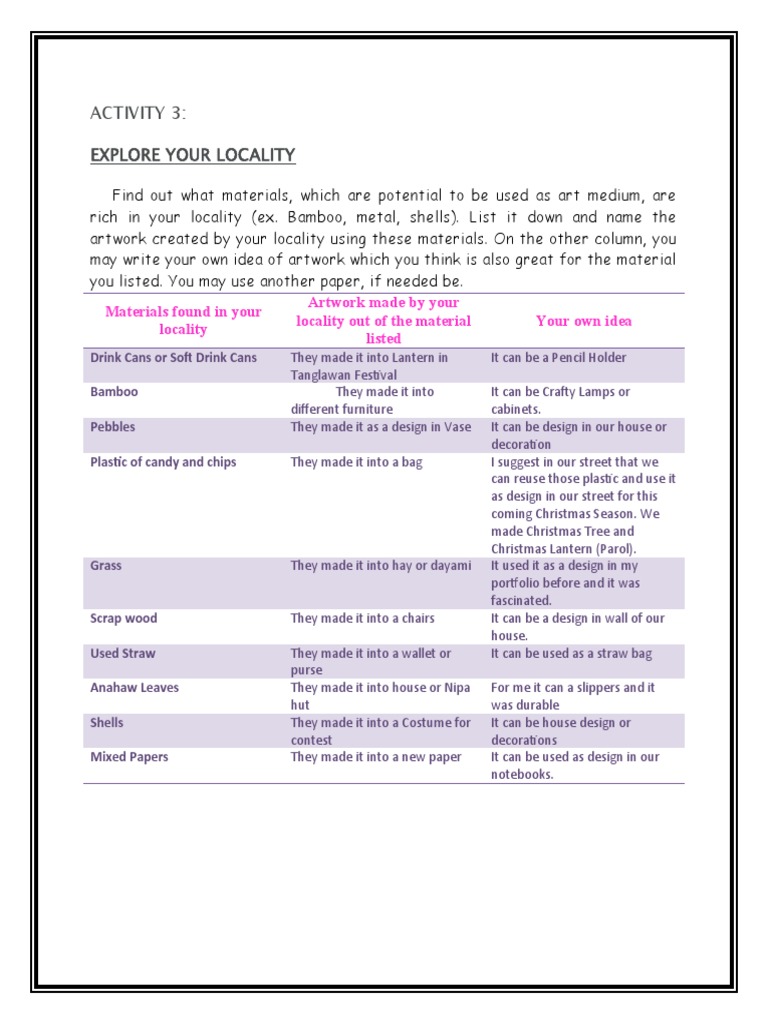 rich in your locality (ex. Bamboo, metal, shells). List it down and name the