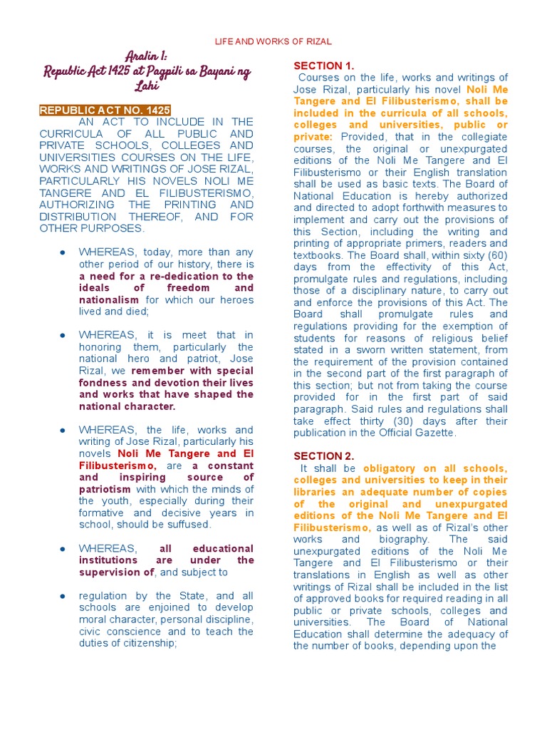 TANGERE AND EL FILIBUSTERISMO, National Education is hereby authorized