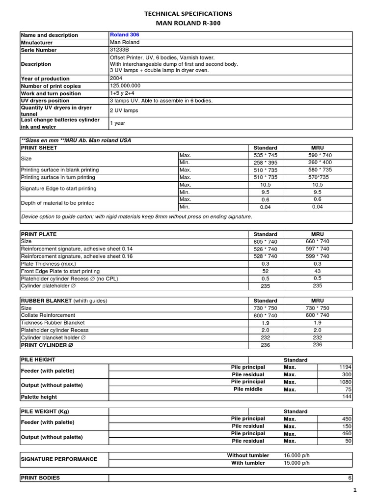 **Sizes en mm **MRU Ab. Man roland USA