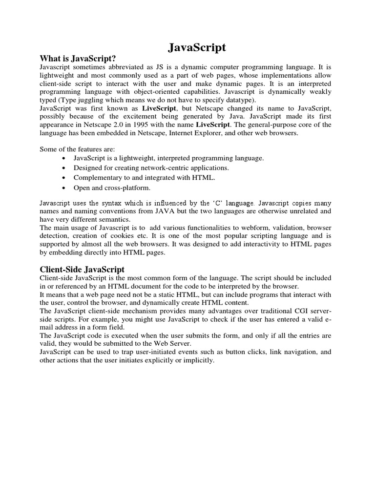 client-side script to interact with the user and make dynamic pages. It is an interpreted