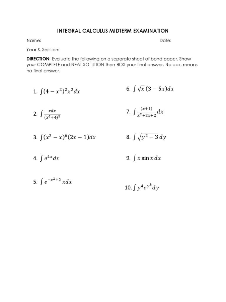 INTEGRAL CALCULUS MIDTERM EXAMINATION