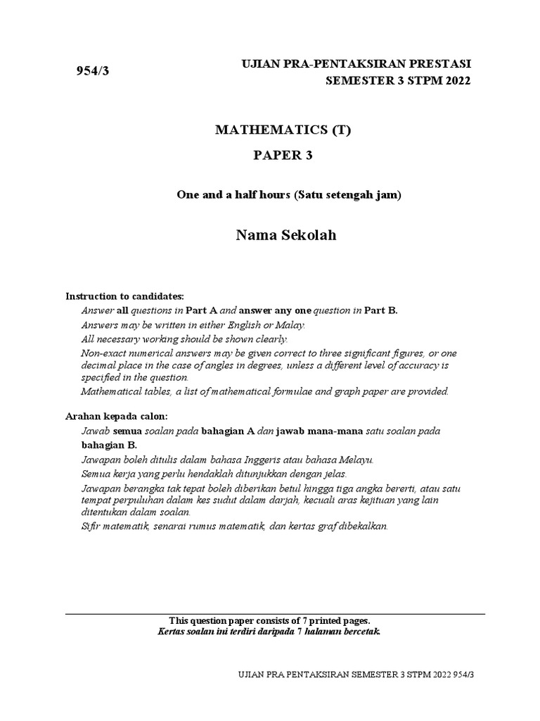 UJIAN PRA PENTAKSIRAN SEMESTER 3 STPM 2022 954/3