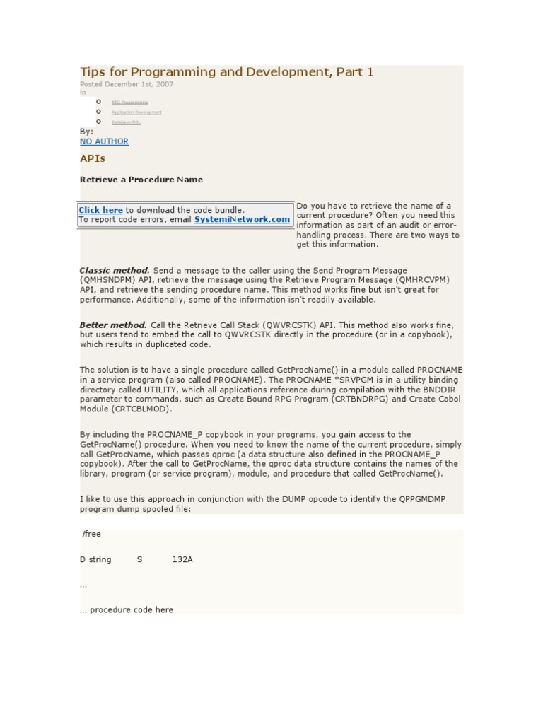 Retrieve a Procedure Name Do you have to retrieve the name of a Click here to download the code bundle. current procedure? Often you need this To report code errors, email SystemiNetwork.com information as part of an audit or errorhandling process. There are two ways to get this information. Classic method. Send a message to the caller using the Send Program Message (QMHSNDPM) API, retrieve the message using the Retrieve Program Message (QMHRCVPM) API, and retrieve the sending procedure name. This method works fine but isn't great for performance. Additionally, some of the information isn't readily available. Better method. Call the Retrieve Call Stack (QWVRCSTK) API. This method also works fine, but users tend to embed the call to QWVRCSTK directly in the procedure (or in a copybook), which results in duplicated code. The solution is to have a single procedure called GetProcName() in a module called PROCNAME in a service program (also called PROCNAME). The PROCNAME *SRVPGM is in a utility binding directory called UTILITY, which all applications reference during compilation with the BNDDIR parameter to commands, such as Create Bound RPG Program (CRTBNDRPG) and Create Cobol Module (CRTCBLMOD). By including the PROCNAME_P copybook in your programs, you gain access to the GetProcName() procedure. When you need to know the name of the current procedure, simply call GetProcName, which passes qproc (a data structure also defined in the PROCNAME_P copybook). After the call to GetProcName, the qproc data structure contains the names of the library, program (or service program), module, and procedure that called GetProcName(). I like to use this approach in conjunction with the DUMP opcode to identify the QPPGMDMP program dump spooled file: /free D string ... ... procedure code here S 132A