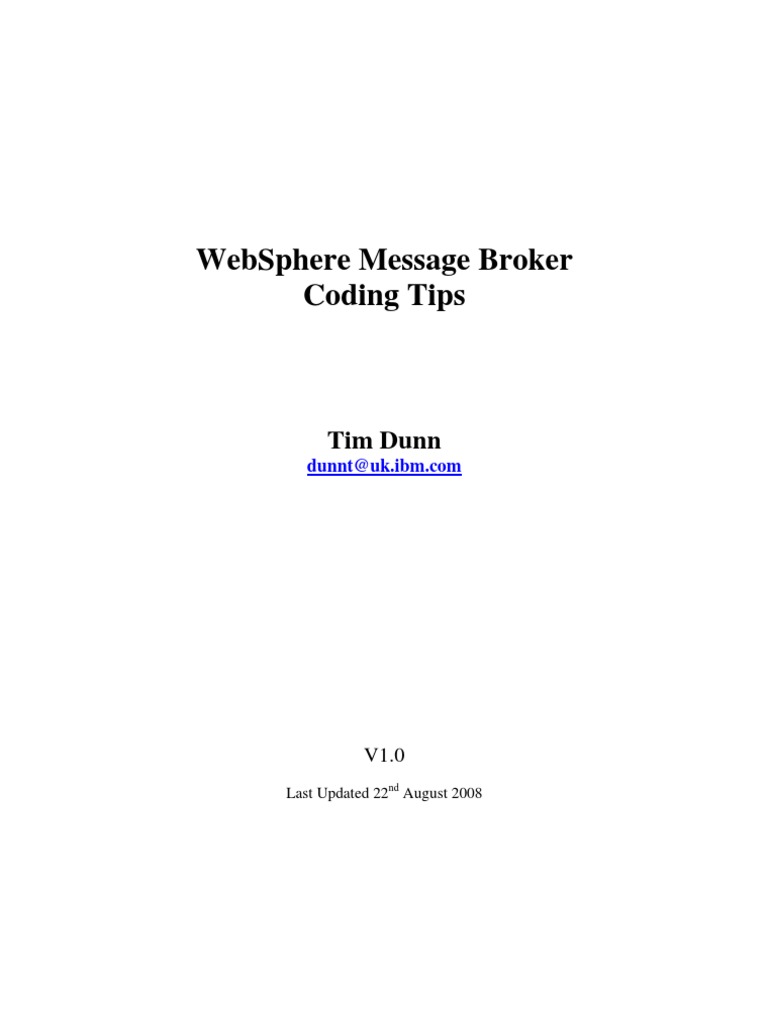 The purpose of this document is to provide coding tips for Message Broker message flow developers. WebSphere Message Broker provides a variety of transformation techniques to the message flow developer or analyst. These range from coding to mapping techniques which use drag and drop technology. These techniques are: ESQL code written in nodes such as Compute, Filter and Database nodes Java written a JavaCompute node eXtensible Stylesheet running in the XMLT node Use of drag and drop facility in the Mapping node WebSphere Transformation Extender running in the WebSphere Transformation Extender plug-in node In theses facilities WebSphere Message Broker explicitly provides support for two programming languages: ESQL and Java. As with any programming language it is possible to unwittingly write ESQL or Java code that is inefficient. This often arises because the developer is not familiar with the implications of using certain features or artefacts of the programming language in a particular way. To help developers produce more efficient message flows and in particular to code more efficient ESQL and Java code in WebSphere Message Broker message flows this article outlines the key performance issues and documents some recommended best practices for code development. You will see by the side of each tip an indication of whether it helps with CPU and/or memory consumption. [CPU] indicates that using this tip will help to reduce CPU usage by a message flow. [Memory] indicates that using this tip will help to reduce the amount of memory used by a message flow. [CPU, Memory] indicates that using this tip will help to reduce both CPU and memory usage by a message flow.