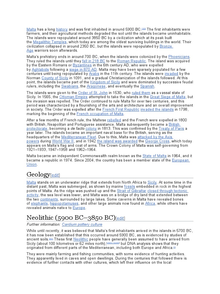 distant past, Malta was submerged, as shown by marine fossils embedded in rock in the highest