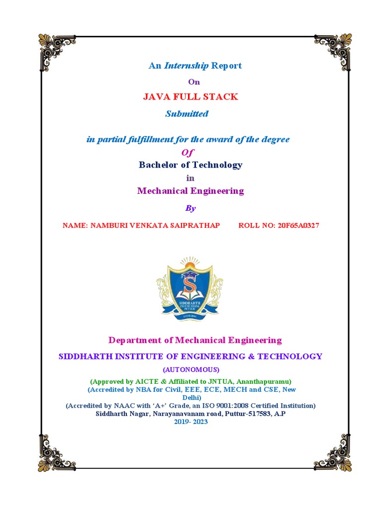 This is to certify that the Mr. / Ms. NAMBURI VENKATA SAIPRATHAP _