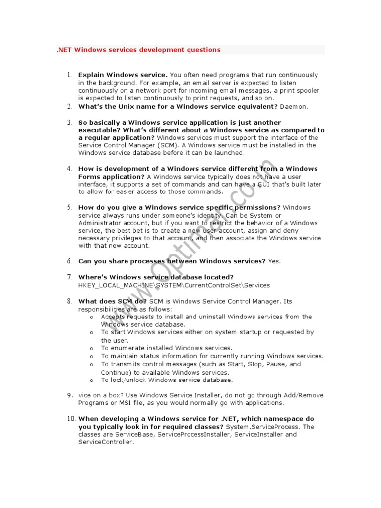 Microsoft .NET Framework interview questions 1. What is .NET Framework? 2. Is .NET a runtime service or a development platform? Answer Its bothand actually a lot more. Microsoft .NET is a company-wide initiative. It includes a new way of delivering software and services to businesses and consumers. A part of Microsoft.NET is the .NET Frameworks. The frameworks is the first part of the MS.NET initiate to ship and it was given out to attendees at the PDC in July. The .NET frameworks consists of two parts: the .NET common language runtime and the .NET class library. These two components are packaged together into the .NET Frameworks SDK which will be available for free download from Microsofts MSDN web site later this month. In addition, the SDK also includes command-line compilers for C#, C++, JScript, and VB. You use these compilers to build applications and components. These components require the runtime to execute so this is a development platform. When Visual