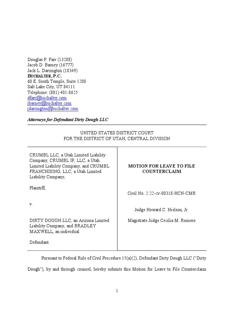 1. On or about May 10, 2022, Crumbl filed a Complaint against Dirty Dough asserting