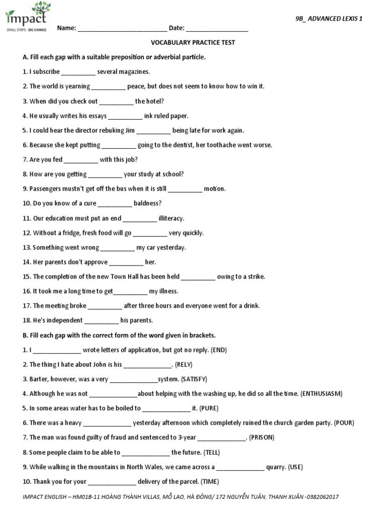A. Fill each gap with a suitable preposition or adverbial particle.