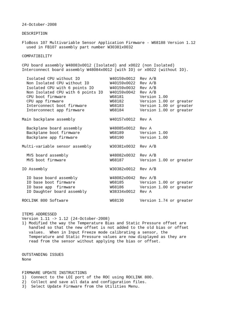 FloBoss 107 Multivariable Sensor Application Firmware - W68188 Version 1.12