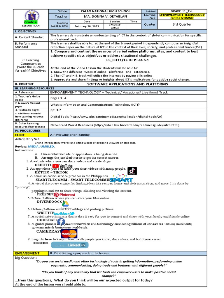 ENGAGEMENT B. Establishing a purpose for the lesson