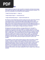 Modern digital technology has made it possible to manipulate multidimensional Signals with systems that range from simple digital circuits to advanced parallel computers. The goal of this manipulation can be divided into three categories: Image Processing image in -> out Image Analysis image in Image Understanding image in > -level description out An image defined in the real world is considered to be a function of two real variables, for example, a(x,y) with a as the amplitude (e.g. brightness) of the image at the real coordinate position (x,y). An image may be considered to contain sub-images sometimes referred to as regions of interest (ROI) or simply regions. This concept reflects the fact that images frequently contain