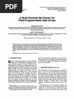 global router will break the net into a set of twoterminal5 connections and route each set independently. The global router considers for each connection multiple ways of routing it and chooses the one that passes through the least congested routing channels. By keeping track of the usage of each routing channel, congestion is avoided; and the principal objective of the global router, balancing the usage of the routing channels, is achieved. Once all connections have been coarse routed, the solution is optimized by ripping up and re-routing each connection a small number of times. After that, the final solution is passed to the detailed router. B. Detail routing The detail router determines for each two point connection the specific wiring segments to use in the routing channel assigned by the global router. To do this, detail routing algorithms construct a directed graph from the routing resources to represent the available connection between wires, C blocks, S blocks and logic blocks within the FPGA. The search performed on this directed graph is usually based on Dijkstras algorithm to find the shortest path between two nodes. The paths are labeled according to a cost function that takes into account the usage of each wire segment and the distance of the interconnecting points. The distance is estimated by calculating the wire length in the bounding box of the interconnecting points using a Manhattan metric. Most of the routers relax the bounding box constraints and allow searching for possible solutions in the surrounding routing channels of the bounding box. This is done to avoid subsequent iterations of ripping out and re-routing if the solution lies on the near outside of the bounding box. The most common detail routing algorithms are: Maze Router The Maze routing algorithm is based on a wavefront expansion technique that attempts to find the shortest path between two points while avoiding any used routing resources [4]. This algorithm is an iterative process that rips up and re-routes some of the routes to eliminate congested routing channels. The principal drawback of the maze routing is that it does the routing without taking into account that the path found can block the routing of the subsequent nets. This means that the performance of the algorithm is net ordering dependent, and different orderings will yield