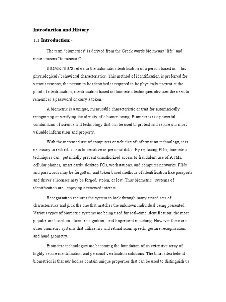 Introduction:The term "biometrics" is derived from the Greek words bio means life and