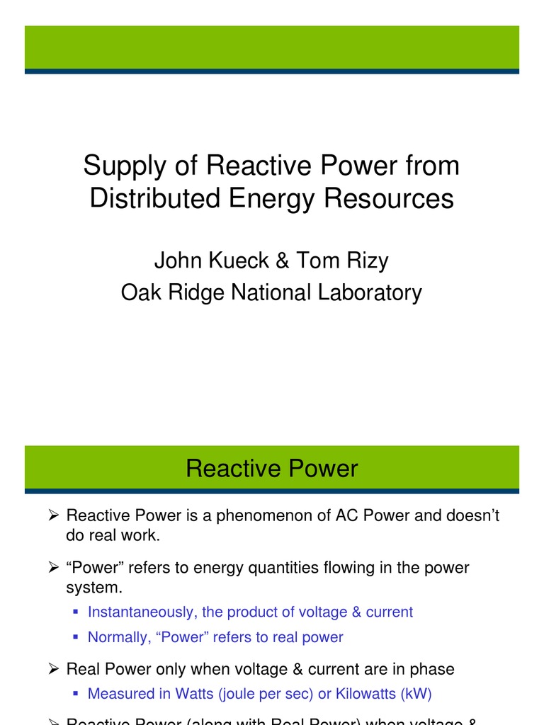 1) Evaluate economic & engineering feasibility of supplying reactive power locally from DE to regulate local voltage and control power factor to improve the efficiency and reliability of the utility distribution system. 2) Determine if reactive power can be supplied from local DE sources with independent voltage control so that an expensive hierarchical control & communications system is not required. 3) Address key barriers to the local supply of reactive power so that it may be supplied without requiring the local utility to either modify the existing distribution system or perform engineering analysis of the circuit.