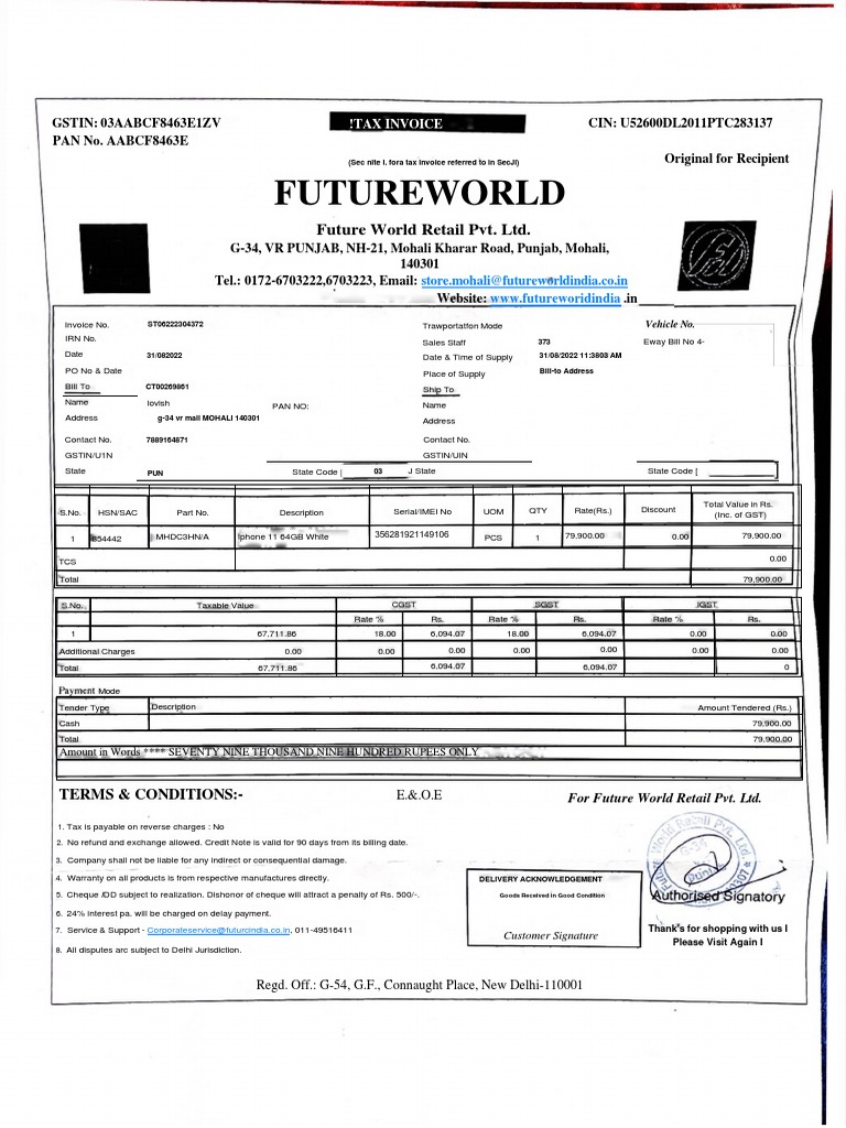 1 854442 MHDC3HN/A Iphone 11 64GB White 356281921149106 PCS 1 79,900.00 0.00 79,900.00