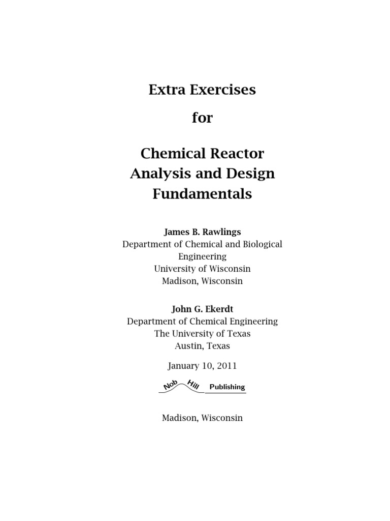 Copyright c 2011 by Nob Hill Publishing, LLC All rights reserved. Nob Hill Publishing, LLC Cheryl M. Rawlings, publisher Madison, WI 53705 orders@nobhillpublishing.com http://www.nobhillpublishing.com The extra exercises are intended for use by students and course instructors. Solutions for selected extra exercises are provided. This document has been posted electronically on the website: www. che.wisc.edu/~jbraw/chemreacfun.