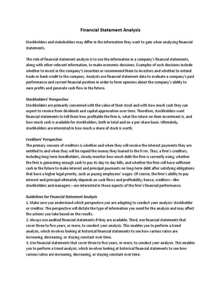 or creditor. The perspective will dictate the type of information you need for the analysis and may affect