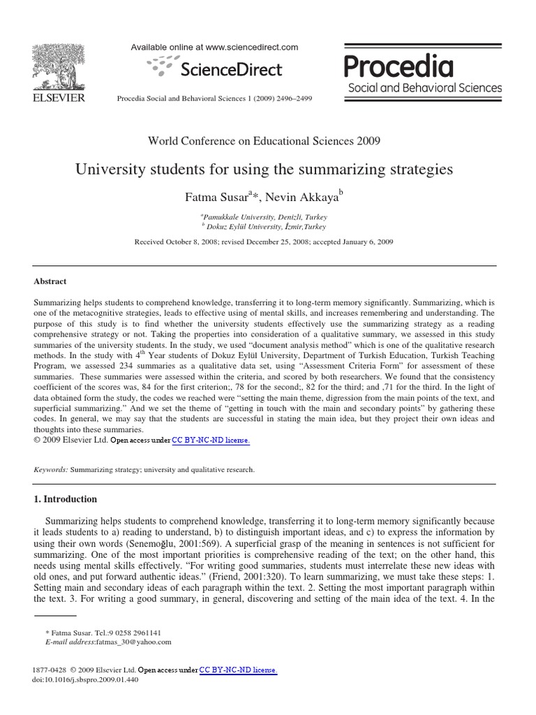 Purpose of the study is to understand whether university students effectively use summarizing strategy as a reading