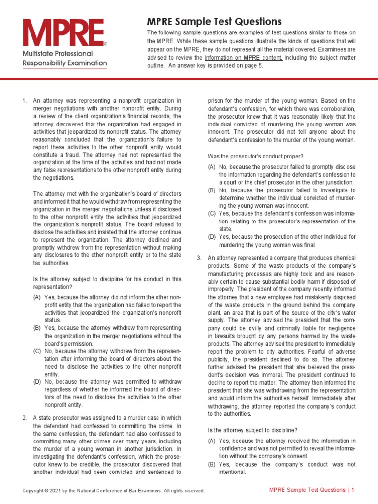 Copyright © 2021 by the National Conference of Bar Examiners. All rights reserved. MPRE Sample Test Questions | 1