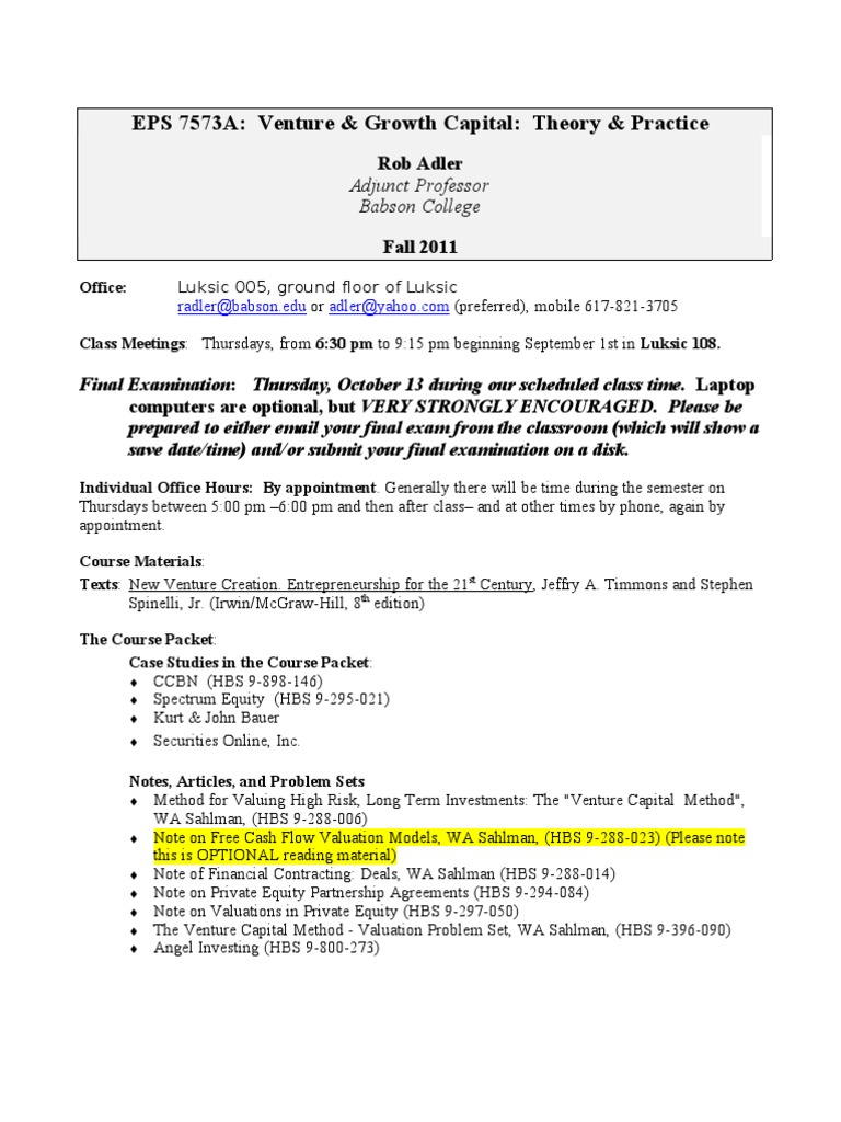 Individual Office Hours: By appointment. Generally there will be time during the semester on Thursdays between 5:00 pm 6:00 pm and then after class and at other times by phone, again by appointment. Course Materials: Texts: New Venture Creation. Entrepreneurship for the 21st Century, Jeffry A. Timmons and Stephen Spinelli, Jr. (Irwin/McGraw-Hill, 8th edition) The Course Packet: Case Studies in the Course Packet: CCBN (HBS 9-898-146) Spectrum Equity (HBS 9-295-021) Kurt & John Bauer Securities Online, Inc. Notes, Articles, and Problem Sets Method for Valuing High Risk, Long Term Investments: The "Venture Capital Method", WA Sahlman, (HBS 9-288-006) Note on Free Cash Flow Valuation Models, WA Sahlman, (HBS 9-288-023) (Please note this is OPTIONAL reading material) Note of Financial Contracting: Deals, WA Sahlman (HBS 9-288-014) Note on Private Equity Partnership Agreements (HBS 9-294-084) Note on Valuations in Private Equity (HBS 9-297-050) The Venture Capital Method - Valuation Problem Set, WA Sahlman, (HBS 9-396-090) Angel Investing (HBS 9-800-273)