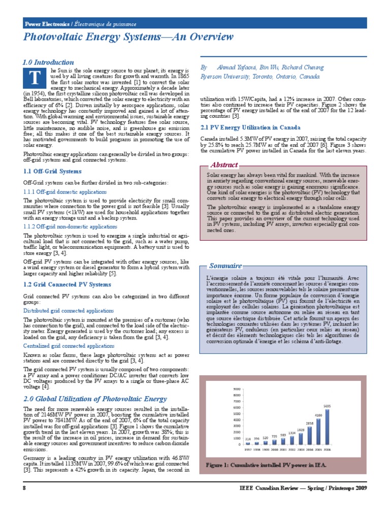 This paper offers a comprehensive overview of the photovoltaic systems and their utilization around the world and in Canada. Different types of the PV systems and applications have been discussed with an emphasis on the grid-connected PV systems, which are widely installed in the world. This paper also provides a state-of-the-art review of power converter technologies Ahmad Yafaoui: received his Bachelor and Master degree in Electrical Engineering from Middle East Technical University, Ankara Turkey, in 1996 and 1998 respectively. He worked as senior design engineer from 1998 to 2006. He is currently a PHD student at Ryerson University, Toronto, Canada. His research interests include solar energy conversion systems and DC/DC converter. Bin Wu (S89M92SM99-F08) received the Ph.D. degree in Electrical and Computer Engineering from the University of Toronto, Canada in 1993. After being with Rockwell Automation as a Senior Engineer from 1992 to 1993, he joined Ryerson University, Toronto, Canada, where he is currently an NSERC/Rockwell Industrial Research Chair and a Professor in the Department of Electrical and Computer Engineering. He has published more than 130 technical papers, authored a Wiley-IEEE Press book, and filed 16 patents (7 issued and 9 pending) in the area of power electronics, renewable energy systems, advanced controls, and adjustable-speed drives. Richard Cheung: received his B.A.Sc., M.A.Sc., and Ph.D. degrees from the University of Toronto. He was a Research Engineer and Consultant for Ontario Hydro. Currently he is a Professor at Ryerson University, President of RC Power Conversions Inc., and Contractor for Siemens at Bruce Power Nuclear Generating Station, Canada.