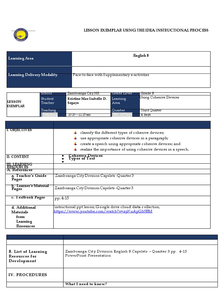 LESSON EXEMPLAR USING THE IDEA INSTRUCTIONAL PROCESS
