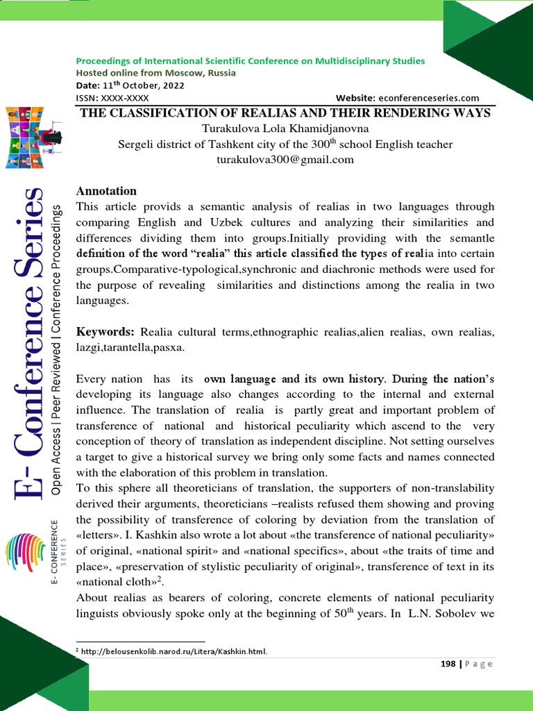 Keywords: Realia cultural terms,ethnographic realias,alien realias, own realias,