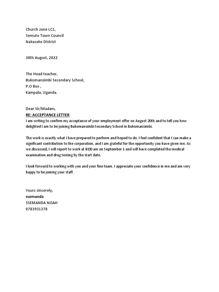I am writing to confirm my acceptance of your employment offer on August 20th and to tell you how
