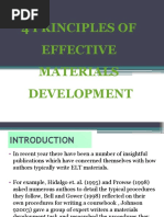 Principles in developing materials Tomlinson (Richards, 2001, p. 263) suggests the basic principles in conducting materials development for the teaching of language as follows: Material should achieve impacts Material should helps learners to feel at ease Materials should help learners to develop confidence What is being taught should be perceived by learners as relevant and useful Materials should require and facilitate learner self-investment Learners must be ready to acquire the point being taught Materials should provide the learners with opportunities to use the target language to achieve communicative purposes. Materials should take into account that the positive effects of instruction are usually delayed Materials should take into account that learners have different learning styles. Materials should take into account that learners differ in affective attitudes Materials should permit a silent period at the beginning of instruction Materials should not rely too much on controlled practice Materials should provide opportunities for outcome feedback In addition, Crawford (Richards & Renandya, 2002, p. 84-87) states that materials obviously reflect the writers views of language and learning, and teachers (and students) will respond according to how well these match their own beliefs and expectations. Thus, she suggests some points to be considered in providing effective materials: Language is functional and must be contextualized Language development requires learner engagement in purposeful use of language The language used should be realistic and authentic Classroom materials will usually seek to include an audio visual component Second language learners need to develop the ability to deal with written as well as spoken genres