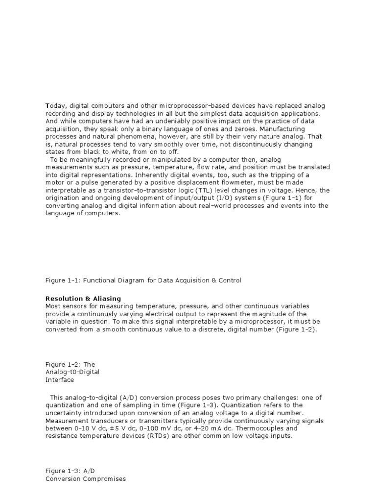 but the simplest data acquisition applications. And while computers have had an undeniably positive impact on the practice of data acquisition, they speak only a binary language of ones and zeroes. Manufacturing processes and natural phenomena, however, are still by their very nature analog. That is, natural processes tend to vary smoothly over time, not discontinuously changing states from black to white, from on to off. To be meaningfully recorded or manipulated by a computer then, analog measurements such as pressure, temperature, flow rate, and position must be translated into digital representations. Inherently digital events, too, such as the tripping of a motor or a pulse generated by a positive displacement flowmeter, must be made interpretable as a transistor-to-transistor logic (TTL) level changes in voltage. Hence, the origination and ongoing development of input/output (I/O) systems (Figure 1-1) for converting analog and digital information about real-world processes and events into the language of computers.