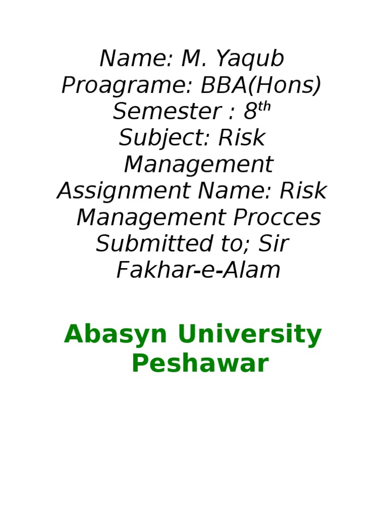 Yaqub Proagrame: BBA(Hons) th Semester : 8 Subject: Risk Management Assignment Name: Risk Management Procces Submitted to; Sir Fakhar-e-Alam