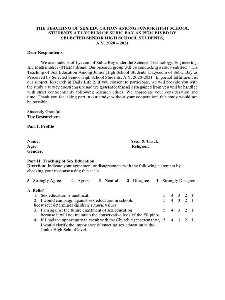 Teaching of Sex Education Among Junior High School Students at Lyceum of Subic Bay as