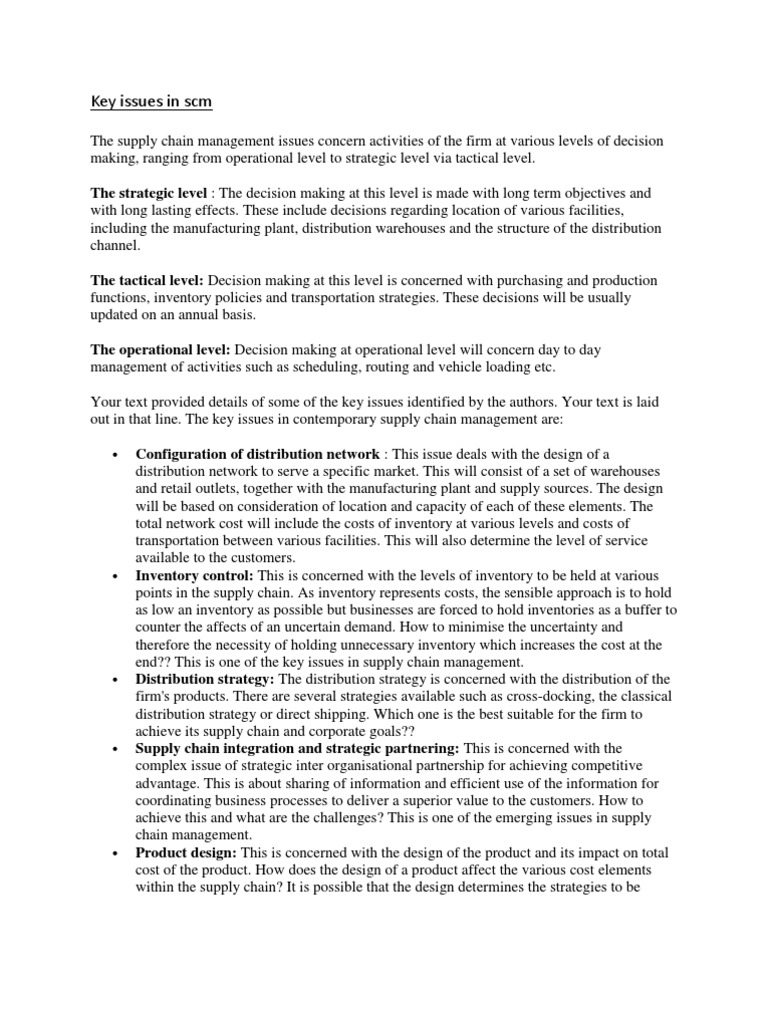 The supply chain management issues concern activities of the firm at various levels of decision making, ranging from operational level to strategic level via tactical level. The strategic level : The decision making at this level is made with long term objectives and with long lasting effects. These include decisions regarding location of various facilities, including the manufacturing plant, distribution warehouses and the structure of the distribution channel. The tactical level: Decision making at this level is concerned with purchasing and production functions, inventory policies and transportation strategies. These decisions will be usually updated on an annual basis. The operational level: Decision making at operational level will concern day to day management of activities such as scheduling, routing and vehicle loading etc. Your text provided details of some of the key issues identified by the authors. Your text is laid out in that line. The key issues in contemporary supply chain management are: