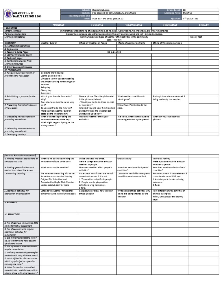 GRADES 1 to 12 Teacher: File created by Sir LIONELL G. DE SAGUN Learning Area: SCIENCE