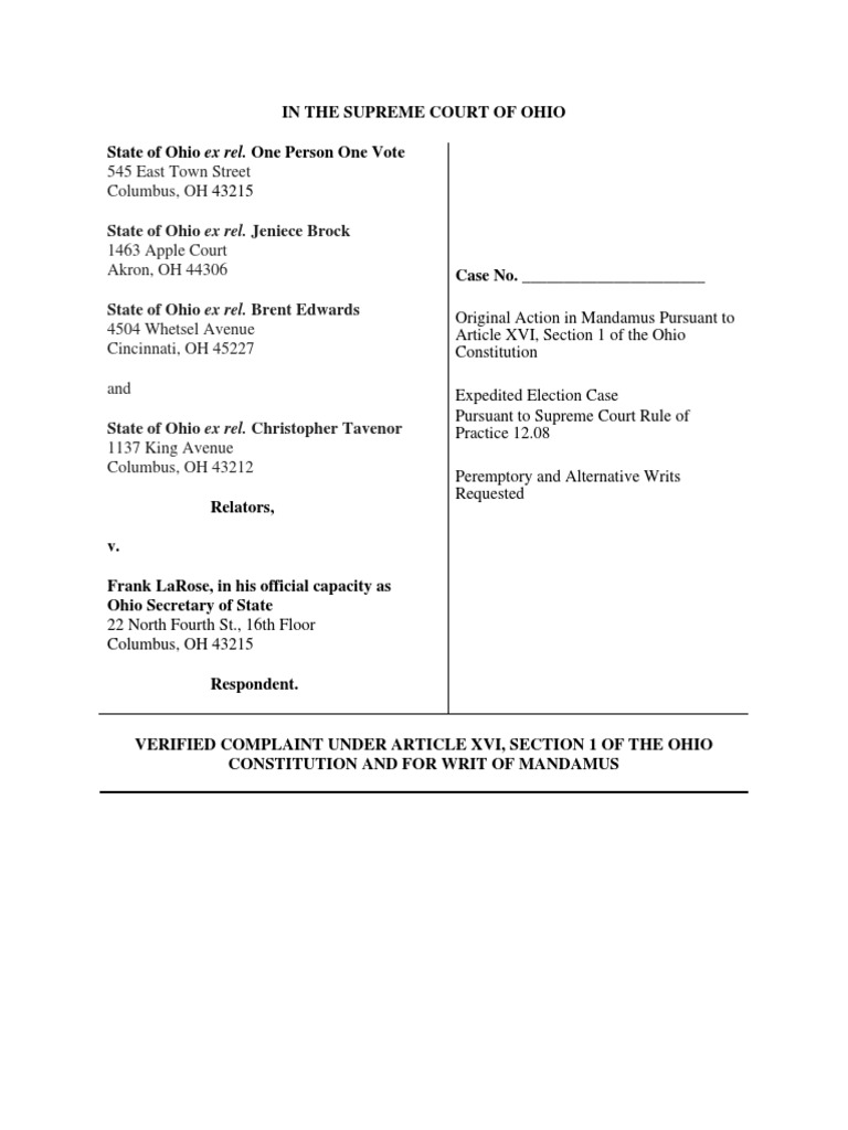 Ohio Secretary of State Frank LaRose to (i) remove the constitutional amendment proposed by