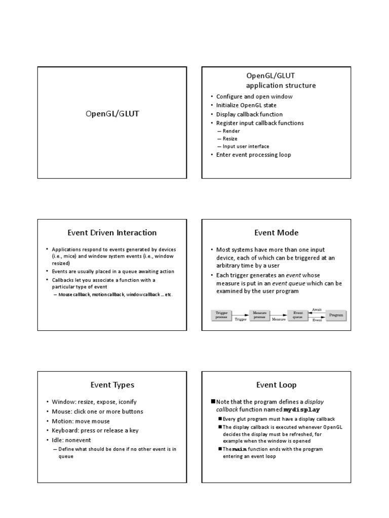 Programming interface for event-driven input Define a callback function for each type of event the graphics system recognizes This user-supplied function is executed when the event occurs GLUT example: glutMouseFunc(mymouse)