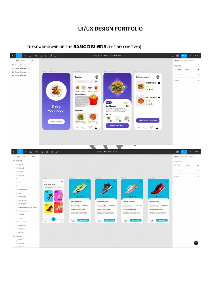 This document outlines a UI/UX design portfolio including basic designs and a premium package order design. The portfolio contains at least two basic designs as introductory examples and a more detailed UI/UX design for ordering a premium package.