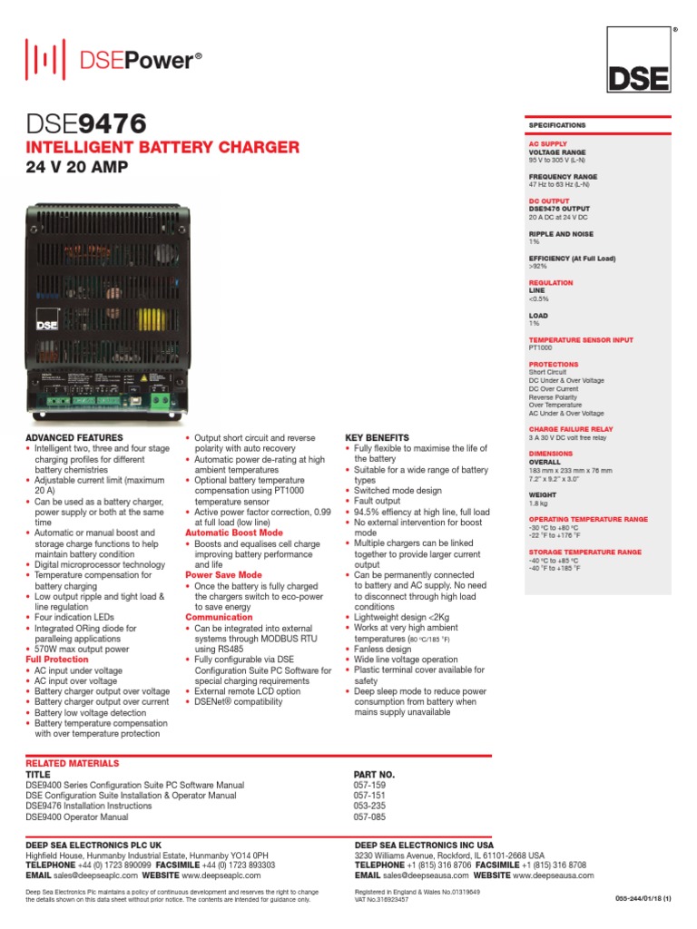 The DSE9476 intelligent battery The chargers do not include any OPERATING TEMPERATURE RANGE