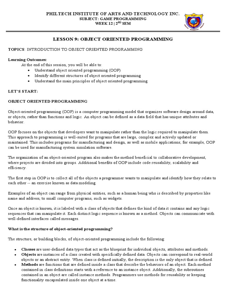 LESSON 9: OBJECT ORIENTED PROGRAMMING