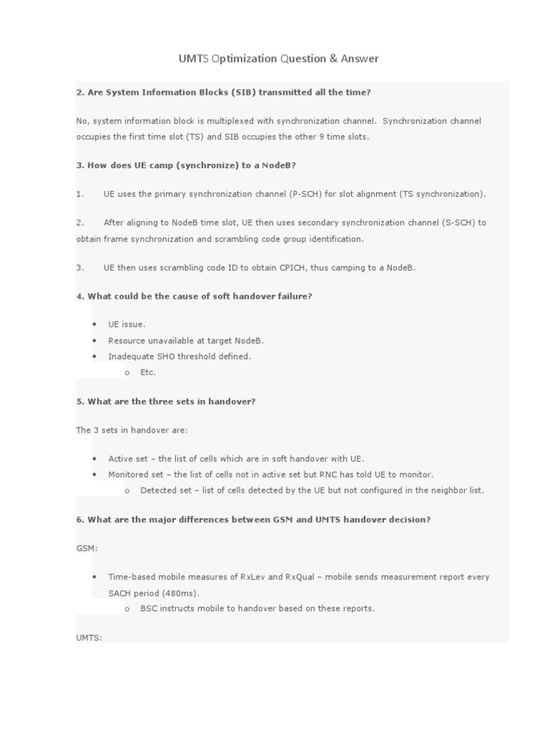 2. Are System Information Blocks (SIB) transmitted all the time? No, system information block is multiplexed with synchronization channel. Synchronization channel occupies the first time slot (TS) and SIB occupies the other 9 time slots. 3. How does UE camp (synchronize) to a NodeB? 1. 2. UE uses the primary synchronization channel (P-SCH) for slot alignment (TS synchronization). After aligning to NodeB time slot, UE then uses secondary synchronization channel (S-SCH) to