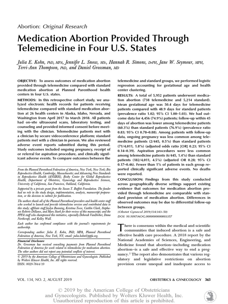 VOL. 134, NO. 2, AUGUST 2019 Kohn et al Medication Abortion Through Telemedicine 349